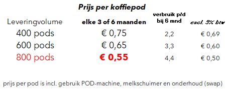 Voor het gebruik van de POD-machine en melkschuimer wordt een borgstelling ingeregeld van € 300.